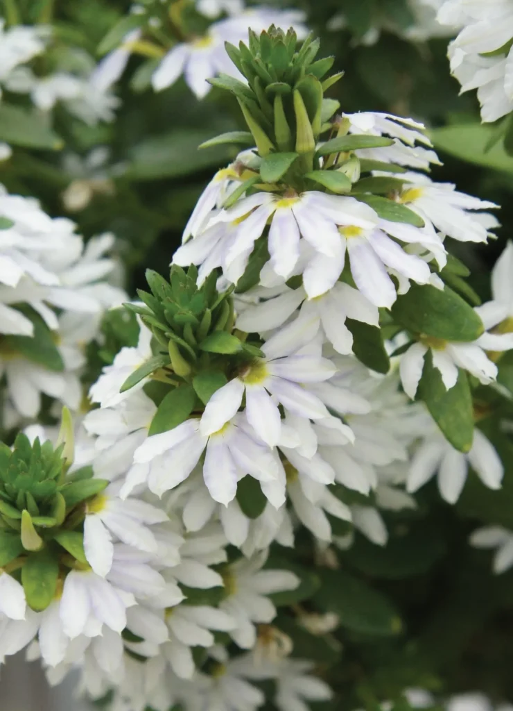 A spreading native groundcover with crisp white fan-shaped flowers over lush green foliage. Blooms throughout the warmer months and handles heat, salt spray and drought. Ideal for coastal gardens, rockeries, pots, or cascading over walls.