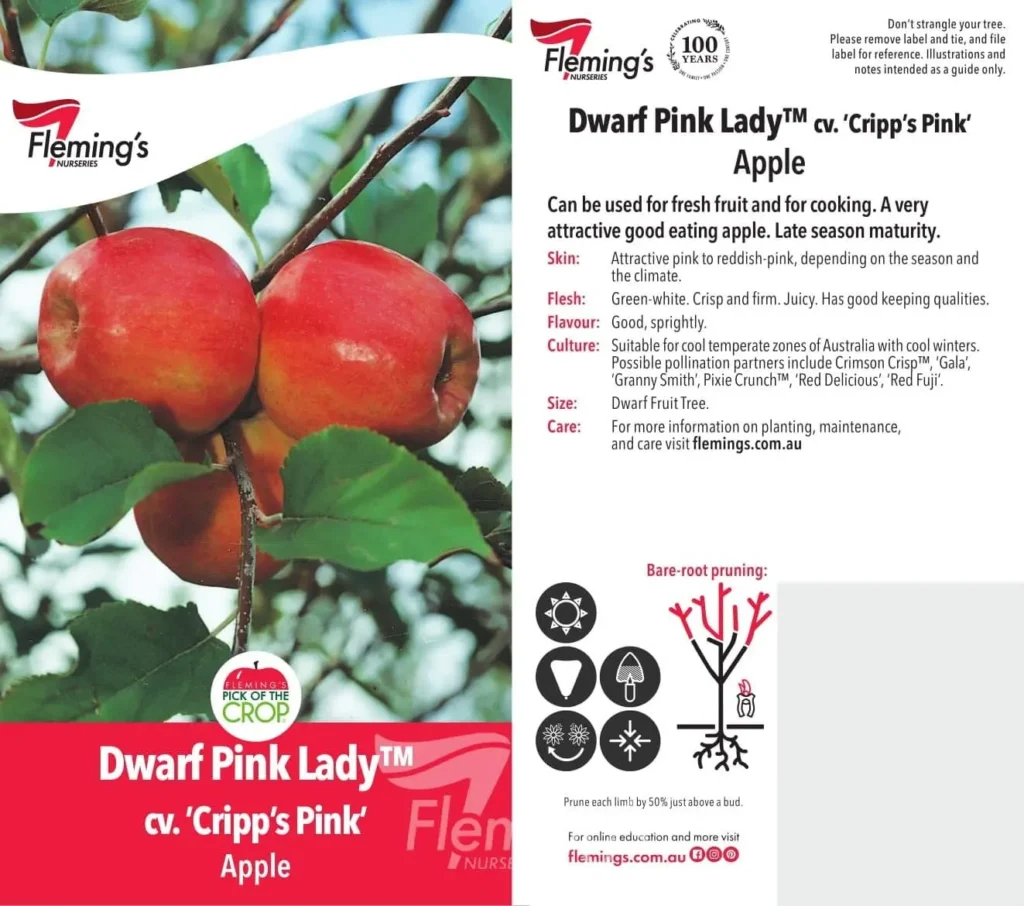 This dwarf tree produces large, pink-blushed fruit with crisp, juicy flesh and a perfect balance of sweetness and tartness. The apples have excellent keeping qualities and are ideal for both fresh eating and cooking. With its striking fruit and fragrant spring blossoms, it’s a favourite for home orchards.