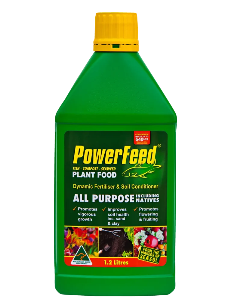 PowerFeed All Purpose is a unique formula that combines the benefits of macronutrients, fish and natural soil conditioners. Safe to use on all plants including natives, vegies, lawns and soils. It boosts plant growth and vigour, promotes flowering and fruiting by providing nitrogen, potassium, trace elements, protein and amino acids.