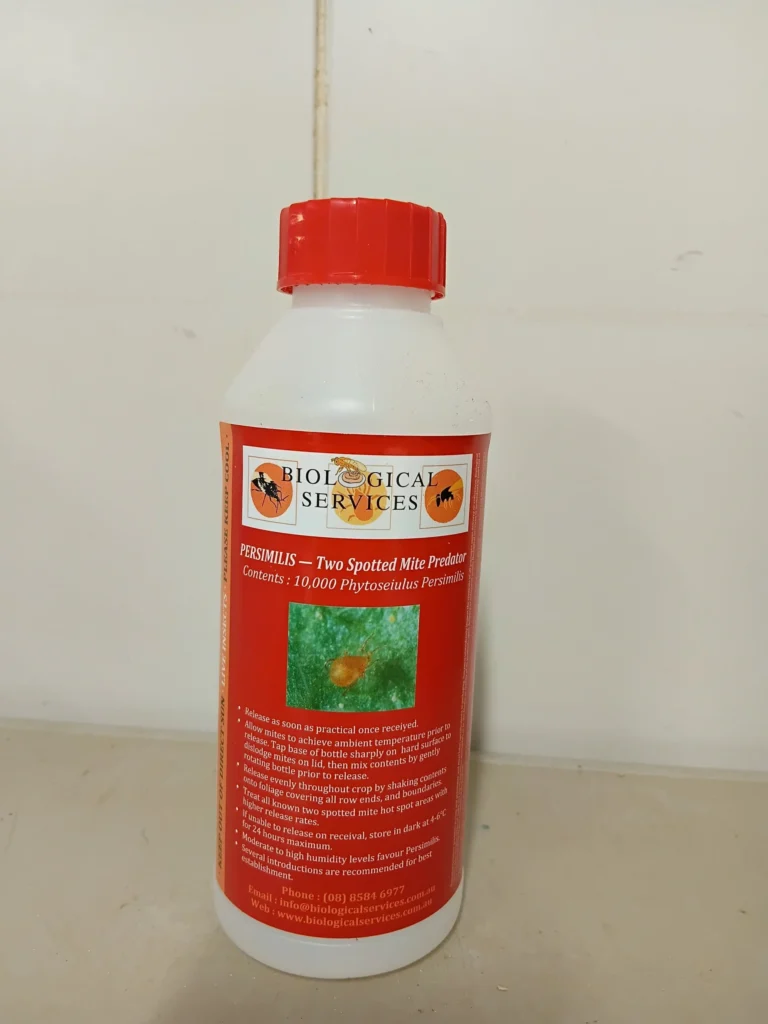 Persimilis (Phytoseiulus persimilis) are predatory mites that feed on two- spotted spider mite (TSM) and other spider mite species. Persimilis can be used on a broad range of crops including strawberries, berry fruit, capsicums, cucumbers, eggplants, tomatoes, hops, cannabis, cut flowers (gerbera, rose, cymbidium orchids), grapevines, some tree crops and many ornamentals.