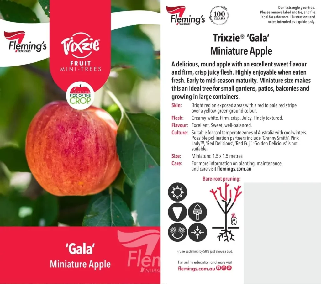 This miniature apple variety produces small, round fruit with bright red skin and subtle striping over a yellow base. The flesh is firm, crisp, and juicy with a sweet, refreshing flavour—perfect for fresh snacking straight from the tree.