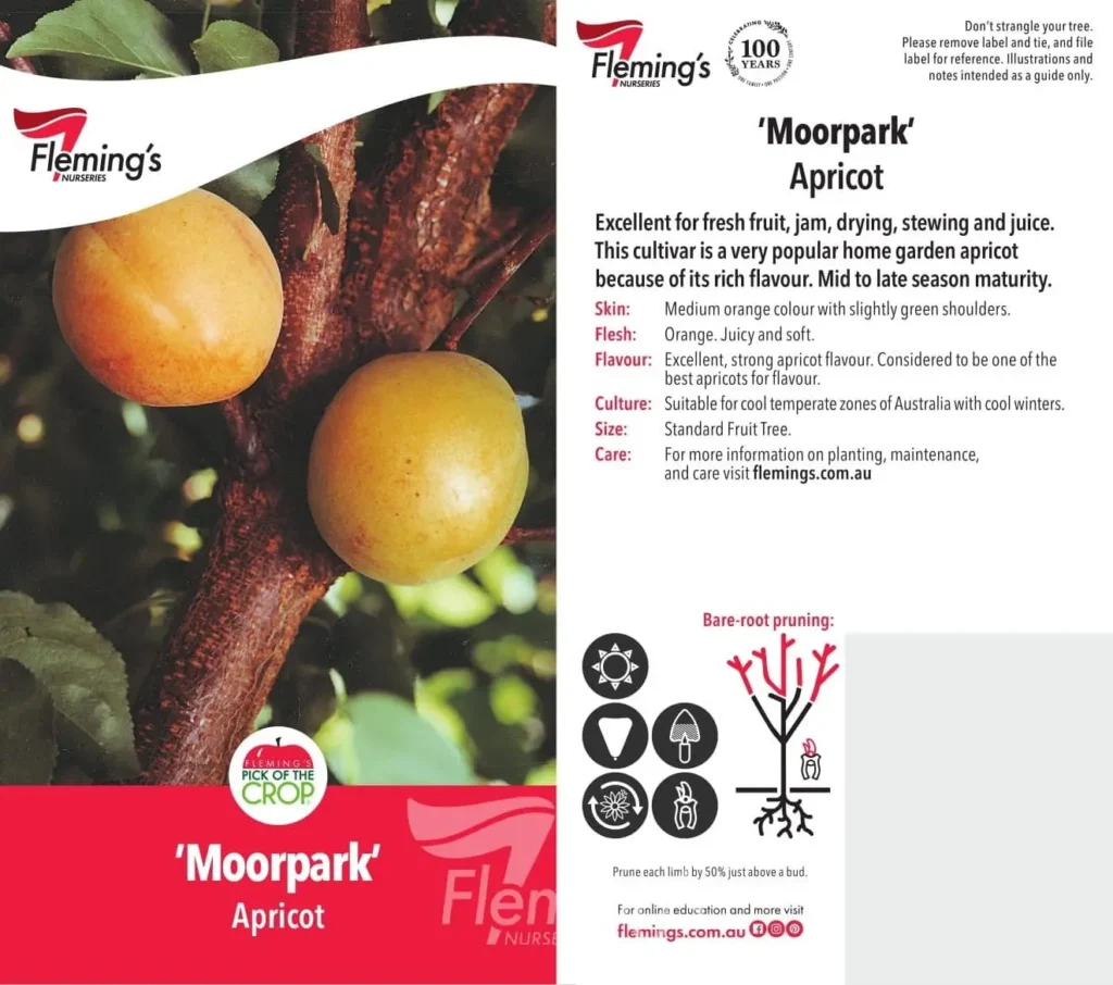 Plant in full sun with well-drained soil—apricots don’t tolerate waterlogging. Apricots are only moderately drought-tolerant and need regular watering to bear fruit. Fertilise in early spring and again in autumn with a balanced fertiliser. Mulch to retain moisture but keep it clear of the trunk. Prune lightly in late summer to maintain shape and encourage airflow. Protect from late frosts during flowering.