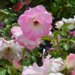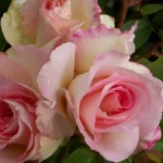 Medium-large, semi-double blooms appear in clusters of up to ten, featuring soft pink petals edged in cream with buff yellow centers. The wavy petals create a delicate, romantic look, while the flowers maintain a classic rounded shape. Known for its repeat flowering, excellent disease and heat resistance, this variety also makes a long-lasting, showy cut flower.