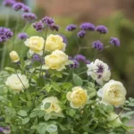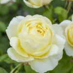 Pink-tinged buds open into medium-sized cups held in large clusters. The blooms are pale yellow, fading to white at the edges, with a rich yellow eye at the center. The fragrance is reminiscent of green tea, with notes of lemon and honey. It forms a bushy, upright shrub.