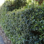 An evergreen shrub with dark green leaves and clusters of small pink buds opening to white flowers, followed by blue-black berries. A classic choice for hedging or mixed borders. Tolerates a range of conditions including part shade and cooler sites