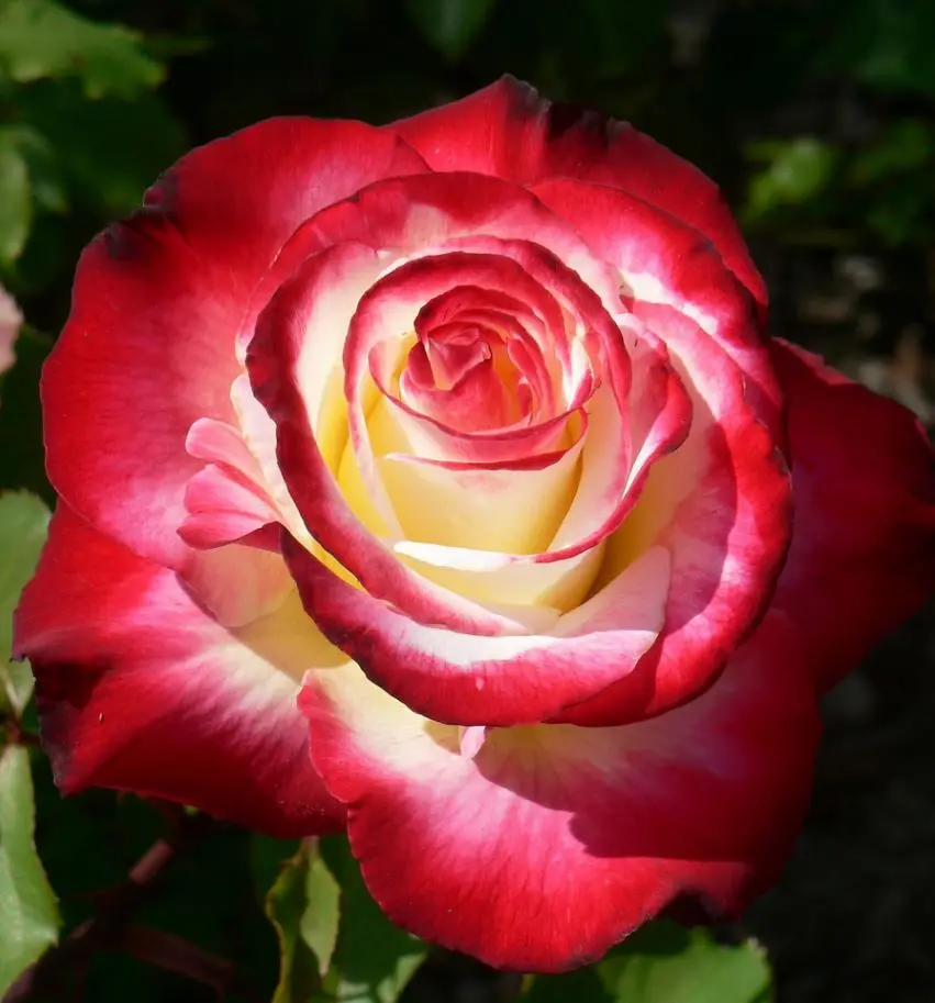 Large, double blooms in creamy white are richly flushed and edged with carmine red, creating a striking two-tone effect. With a high-centred form and strong, sweet fragrance, this rose is a favourite among gardeners and florists alike. It grows on a vigorous, medium-sized bush with long, sturdy stems admired for both its beauty and scent.