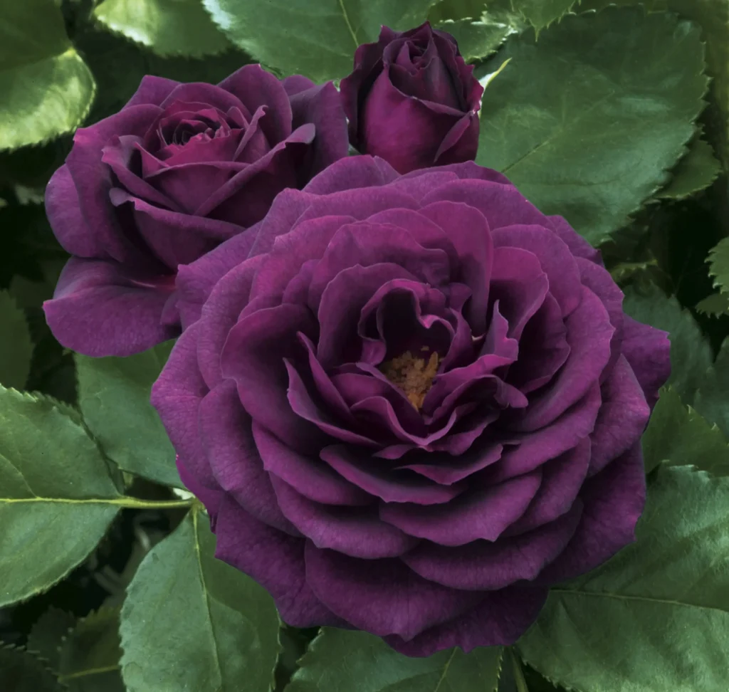 Deep purple, almost black buds unfurl into rich, velvety purple double blooms with an old-fashioned charm and an intense clove fragrance. The exotic flowers are set against dark green foliage with smoky, dusky undertones. Remarkably clean and highly disease-resistant for a rose of such unique colour.