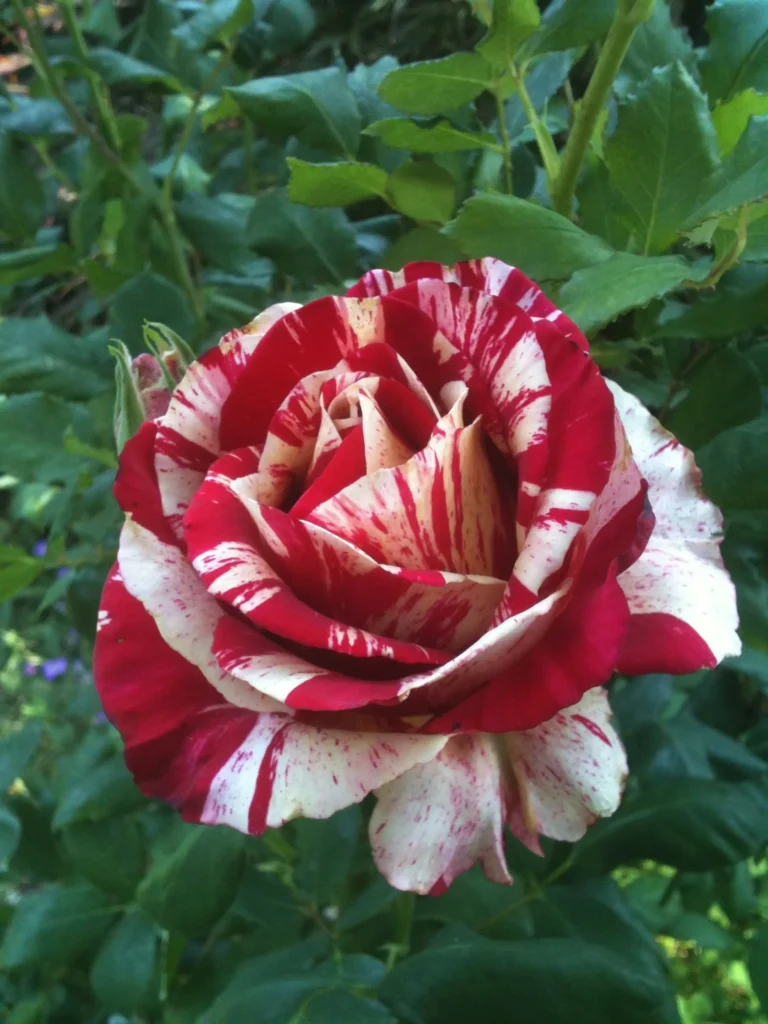 A stunning tiger-striped rose featuring raspberry-red stripes and splashes over a clotted cream background. This beautifully shaped, high-centred bloom offers exceptional vase life, lasting up to two weeks. The striking colours deepen and become more intense in warmer weather, making this rose a heat-loving standout with prolific flowering throughout the season.