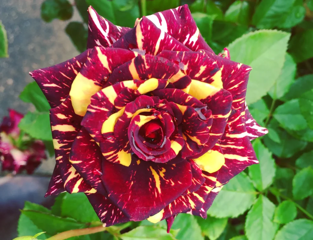 Each bloom is a surprise with this striking striped rose—deep maroon red petals streaked and swirled with golden yellow, creating a unique pattern on every flower. Colour variation shifts with the weather, adding extra magic to the display. Bold and eye-catching in the garden, these blooms also make excellent, conversation-starting cut flowers.