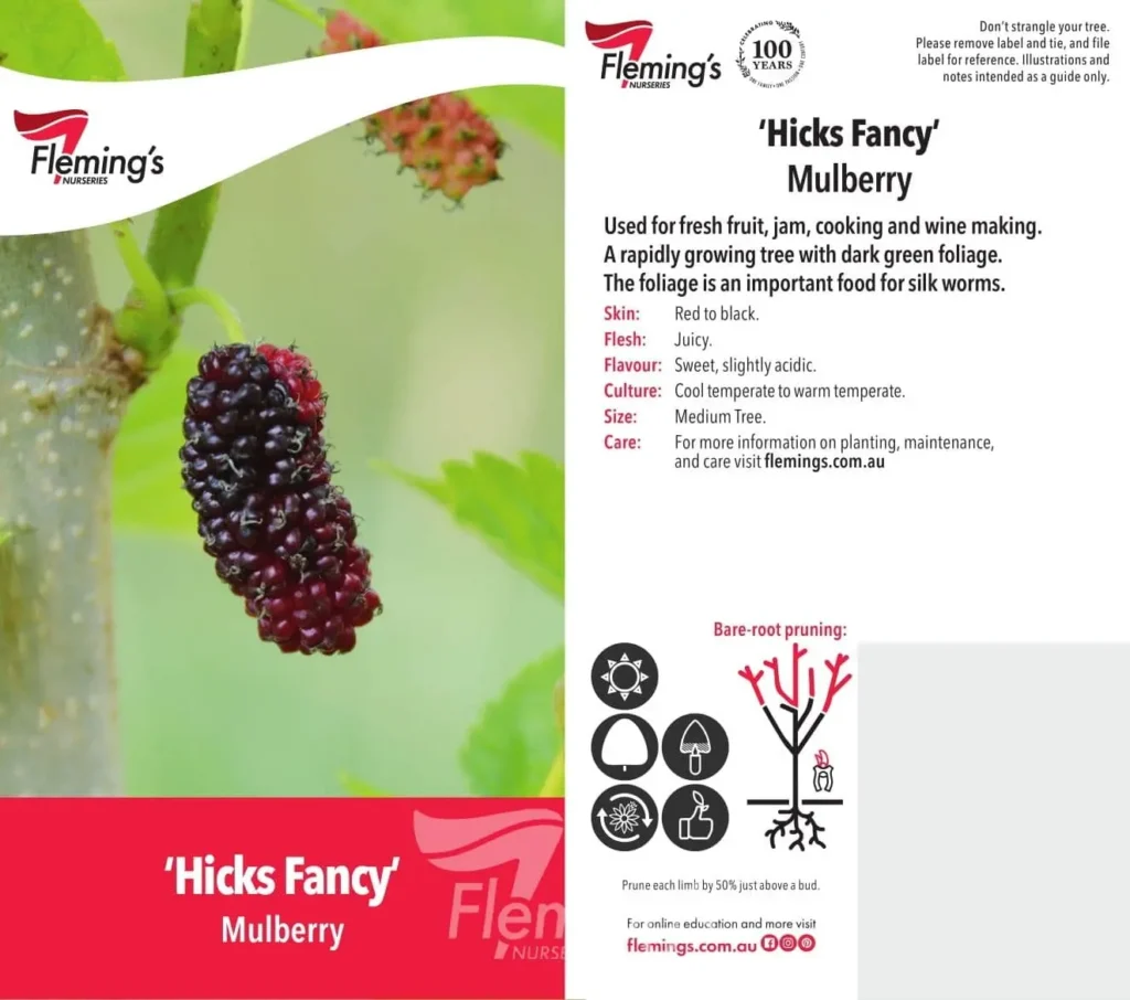 A vigorous, fast-growing deciduous tree with attractive dark green foliage, also valued as food for silkworms. It produces small, plump fruit from late spring to early summer, ripening from red to black. Prolific and early fruiting in November and December, the sweet berries are ideal for fresh eating, jams, cooking, and even winemaking.