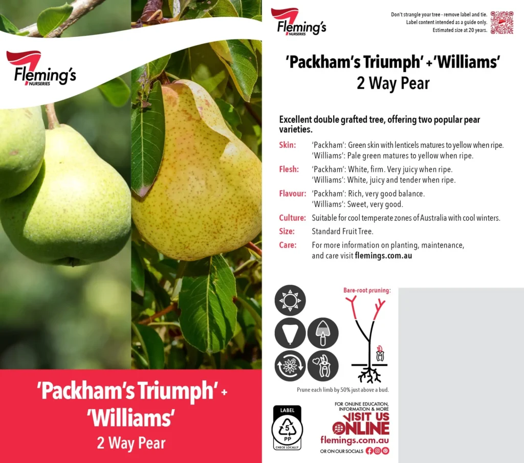 A multi-grafted pear tree featuring Packhams and Williams on a single trunk. Each variety retains its typical fruit characteristics. Grafted varieties are suitable pollinators for each other, with staggered fruiting extending the harvest period. Ideal for home gardens and smaller spaces.