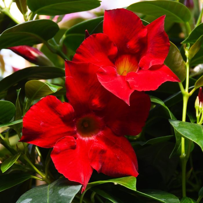 Mandevilla sanderi ‘Summerstar Red’ is a fast-growing, evergreen climber with glossy green foliage and large, vibrant red trumpet-shaped flowers from late spring to autumn. Perfect for privacy screens, arbours, trellises, sunny balconies, or hanging baskets, this tropical beauty provides a striking trailing display and adds bold colour to gardens and patios.