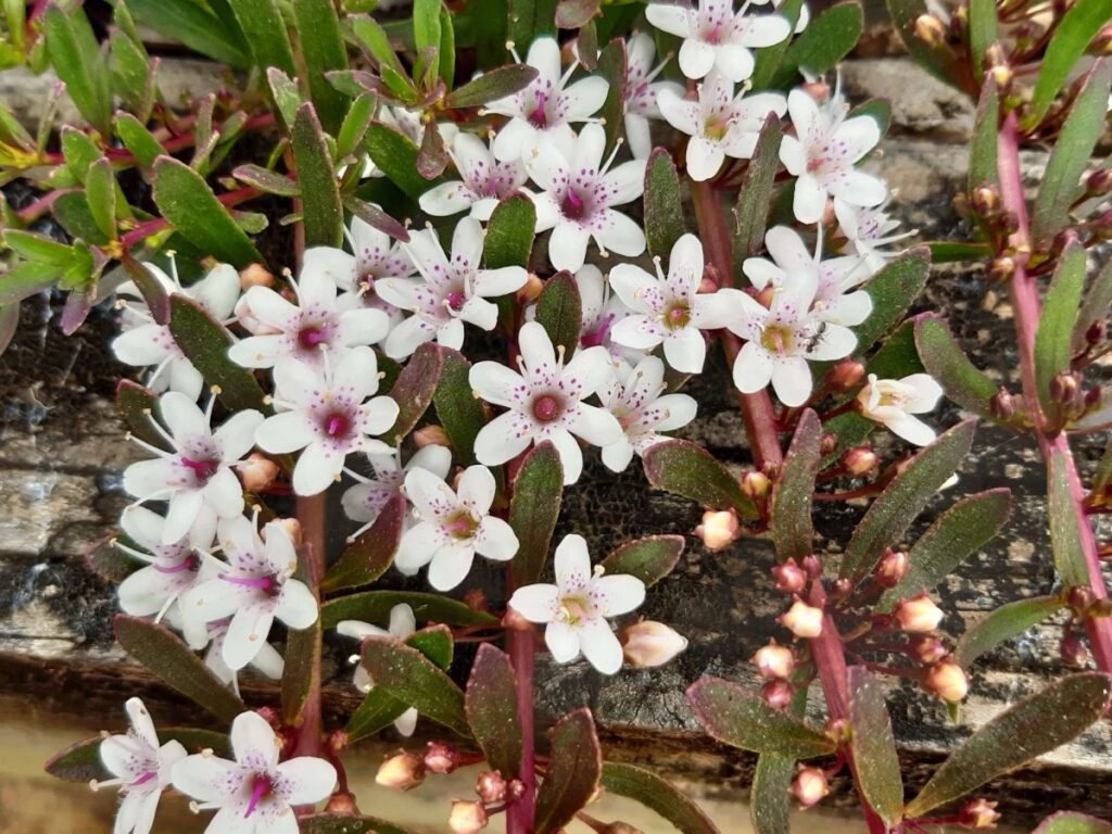 An evergreen matting ground cover with fine, purple-tinged foliage that deepens in winter. In summer, it produces masses of small, starry white flowers that attract garden pollinators. This hardy native has a dense growth habit, making it perfect for rockeries, dry sunny banks, low-maintenance gardens, or hard-to-plant slopes, while also acting as a natural weed suppressant and adding striking colour contrast.