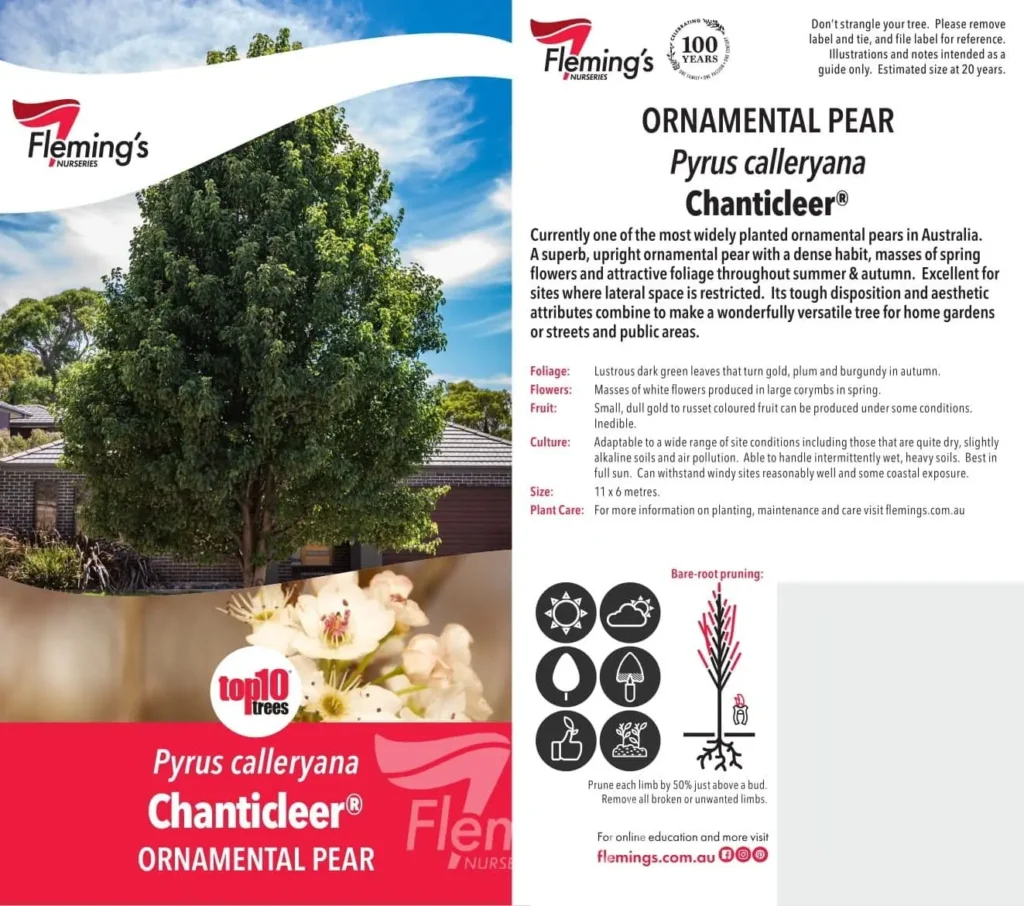 Asuperb upright ornamental pear with a dense, narrowly conical habit, ideal for sites with limited lateral space. It features large clusters of white spring flowers, glossy dark green summer foliage, and vibrant autumn colours ranging from gold and red to deep plum. This medium-sized deciduous tree offers strong year-round structure, making it perfect as a formal feature, street tree, or in home gardens. Its tough nature and striking seasonal displays bring beauty and presence to any landscape.