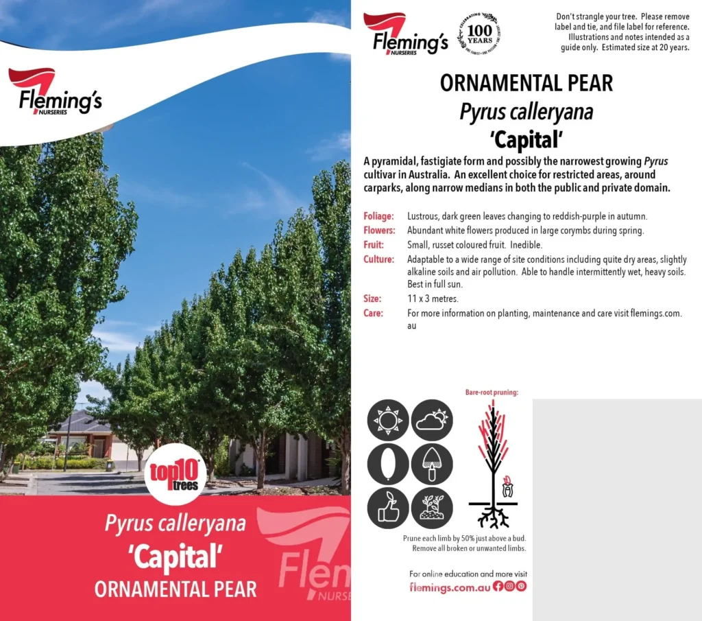 The most slender of the ornamental pears, a standout choice for narrow spaces and restricted planting areas. With its upright, pyramidal form, arguably the narrowest growing cultivar in Australia, it offers strong vertical structure and year round appeal. In early spring, dense clusters of fragrant white flowers cover the branches, attracting pollinators and delivering a striking ornamental display. This tree is ideal for driveways, screens, avenues, and tight garden beds where space is at a premium.