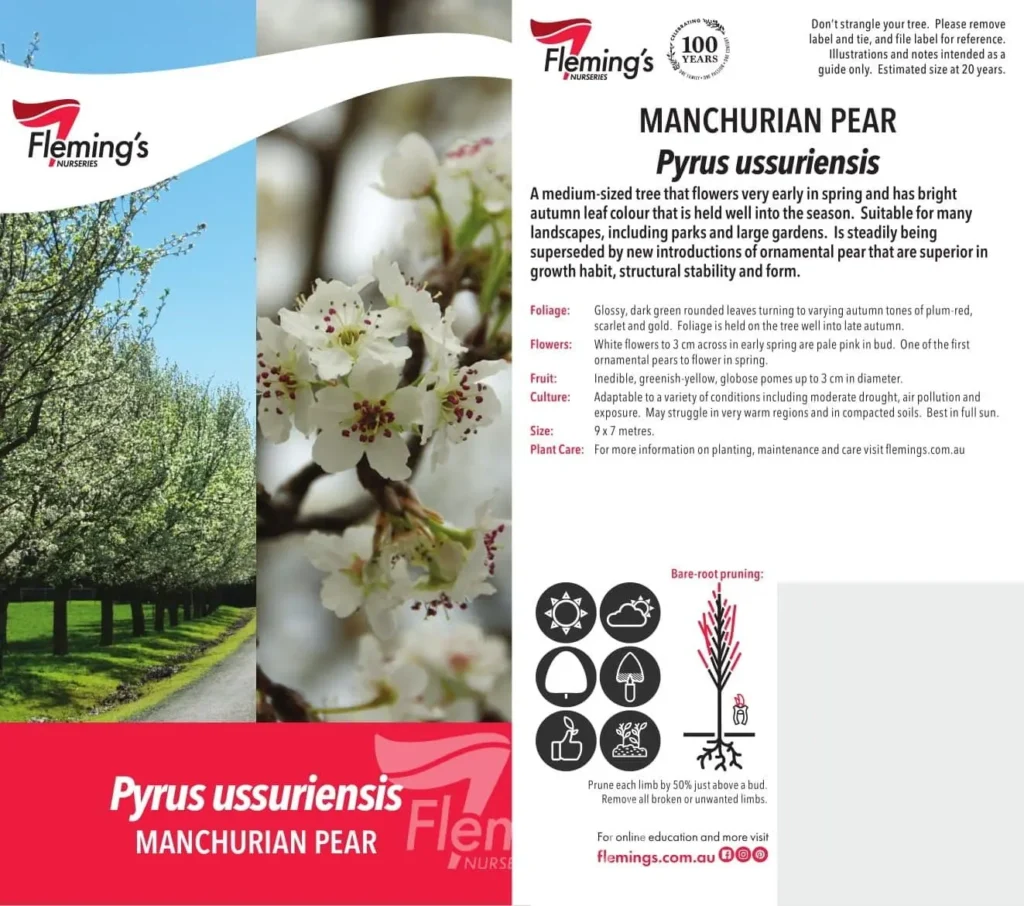 A medium sized ornamental pear, valued for being one of the earliest to flower in spring. It produces clusters of white blossoms before the foliage emerges, creating a striking seasonal display. Glossy, dark green rounded leaves provide summer shade, turning vivid shades of purple/red, scarlet and gold in autumn, colours that linger well into the season. Its balanced shape and moderate size make it a great choice as a shade or feature tree for small to medium gardens.