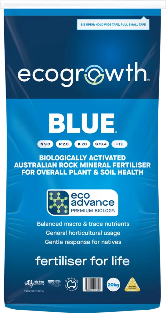 Ecogrowth Blue is a complete and balanced rock mineral-based fertiliser designed for use in all soil types and across a broad range of landscape and horticultural applications. Ecogrowth Blue stimulates root development, shoot growth and fruiting quality through natural ingredients including mineral-based phosphorus and potassium coupled with balanced calcium, magnesium, carbon and trace elements