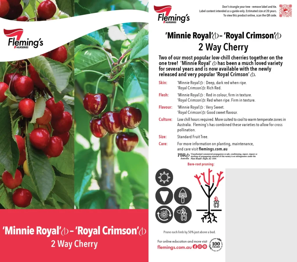 A multi-grafted cherry tree featuring Minnie Royal and Royal Crimson on a single trunk. Each variety retains its typical fruit characteristics. Grafted varieties are suitable pollinators for each other, with staggered fruiting extending the harvest period. Ideal for home gardens and smaller spaces.
