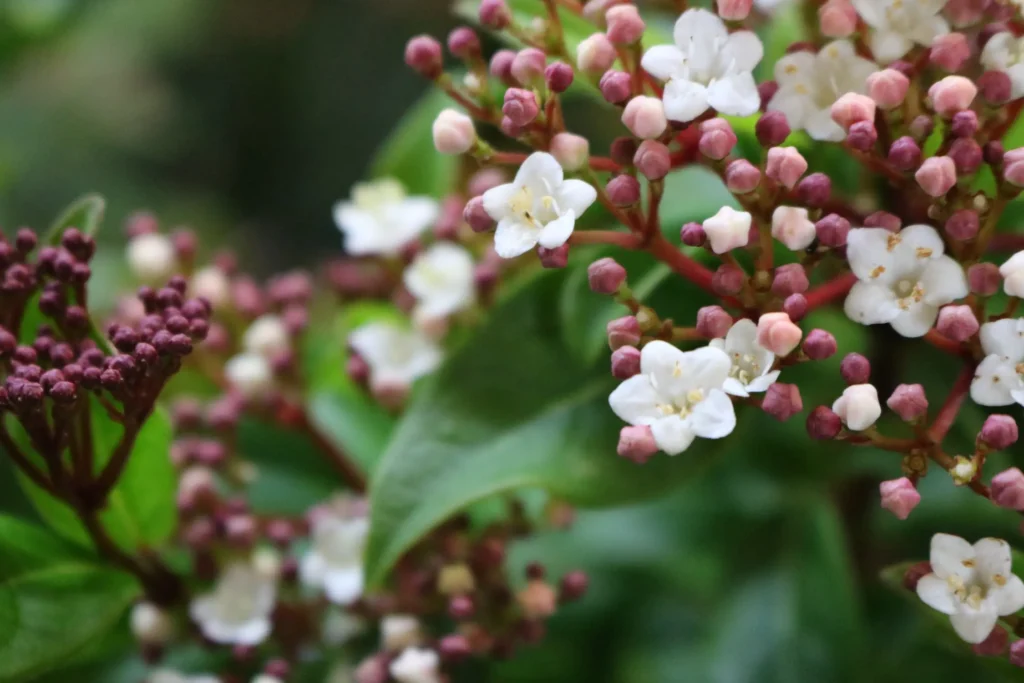 An evergreen shrub with dark green leaves and clusters of small pink buds opening to white flowers, followed by blue-black berries. A classic choice for hedging or mixed borders. Tolerates a range of conditions including part shade and cooler sites