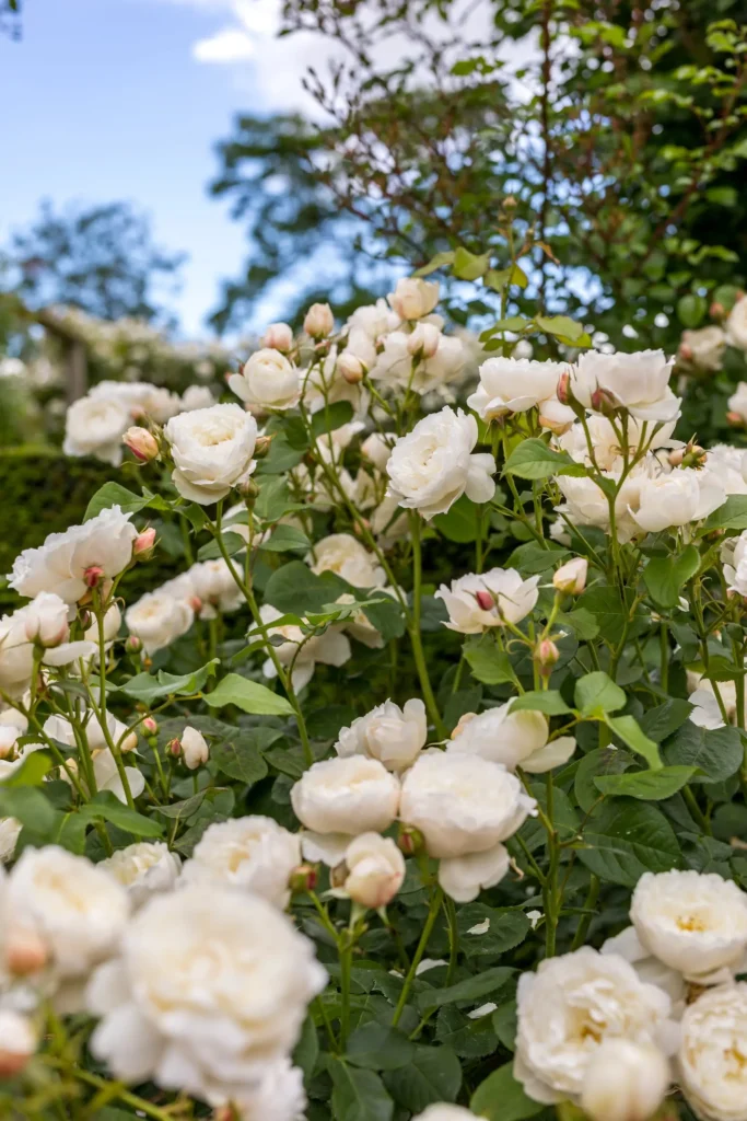 Delicate, white blooms with shallow cups and full petals appear with impressive regularity throughout the summer months. Their pure myrrh fragrance adds a classic charm, while the plant’s bushy, upright growth creates an elegant and balanced shrub