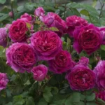 Large, deeply cupped blooms in a rich blend of deep pink, magenta, and red, with outer petals softening to light purple and an almost silvery sheen. The fragrance is a captivating mix of Tea and Old Rose, lifted by subtle notes of cedar wood.