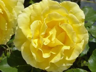 Classic shapped yellow blooms shine on distinctive deep green foliage. This repeat flowering rose creates a stiking display.