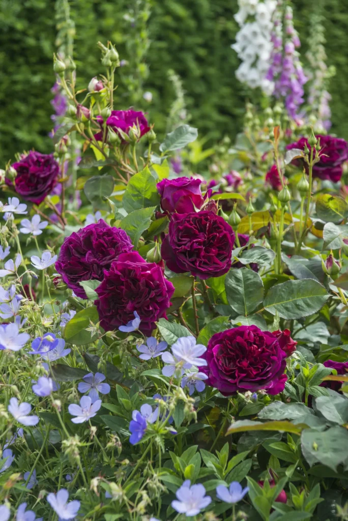 This rose produces deep, velvety crimson blooms with lighter outer petals. Initially large and cup-shaped, the flowers gradually become shallowly cupped over time. A strong Old Rose fragrance fills the air, with delightful fruity notes of blackberry, blueberry, and damson.