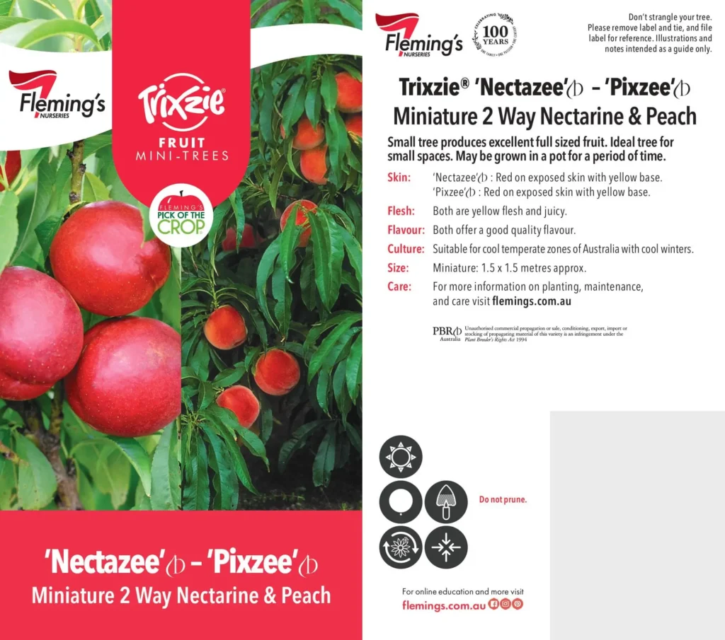 A multi-grafted nectarine tree featuring Nectazee and Pixzee on a single trunk. Each variety retains its typical fruit characteristics. Grafted varieties are suitable pollinators for each other, with staggered fruiting extending the harvest period. Ideal for home gardens and smaller spaces.