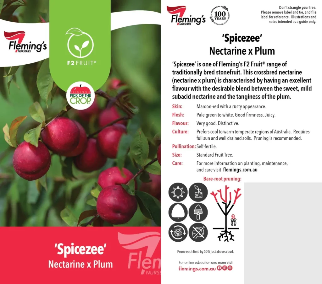 This interspecific nectarine is a unique cross between a nectarine and a plum, offering an exceptional flavour that balances the sweet, mild taste of nectarine with the tangy zing of plum. The deciduous tree produces masses of fragrant pink spring flowers, followed by large, juicy, pink-fleshed fruit in summer. Its striking foliage emerges deep red in spring, turning dark green as the season progresses, adding ornamental appeal to productive beauty.