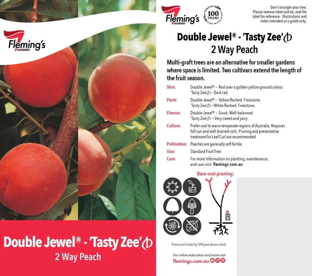 A multi-grafted peach tree featuring Tasty Zee and Double Jewel on a single trunk. Each variety retains its typical fruit characteristics. Grafted varieties are suitable pollinators for each other, with staggered fruiting extending the harvest period. Ideal for home gardens and smaller spaces.