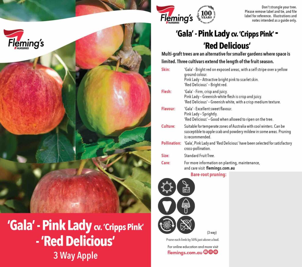 A multi-grafted apple tree featuring Gala, Pink Lady, and Red Delicious on a single trunk. Each variety retains its typical fruit characteristics. Grafted varieties are suitable pollinators for each other, with staggered fruiting extending the harvest period. Ideal for home gardens and smaller spaces