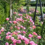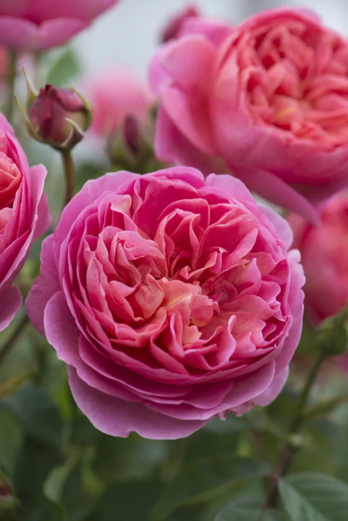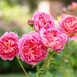 Beautifully formed coral-pink rosette blooms adorn this medium-sized shrub, complemented by a delicious fragrance that fills the air